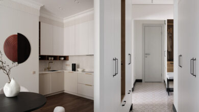 Если вынести эту полку вглубь коридора, что позволяет ее небольшая глубина в 29 см, то на ней можно расставить комнатные растения и другой декор. Выше стоит повесить зеркало, а пространство снизу оставить пустым. Комод на этом месте занял бы намного больше места и смотрелся гораздо массивнее и тяжелее.
