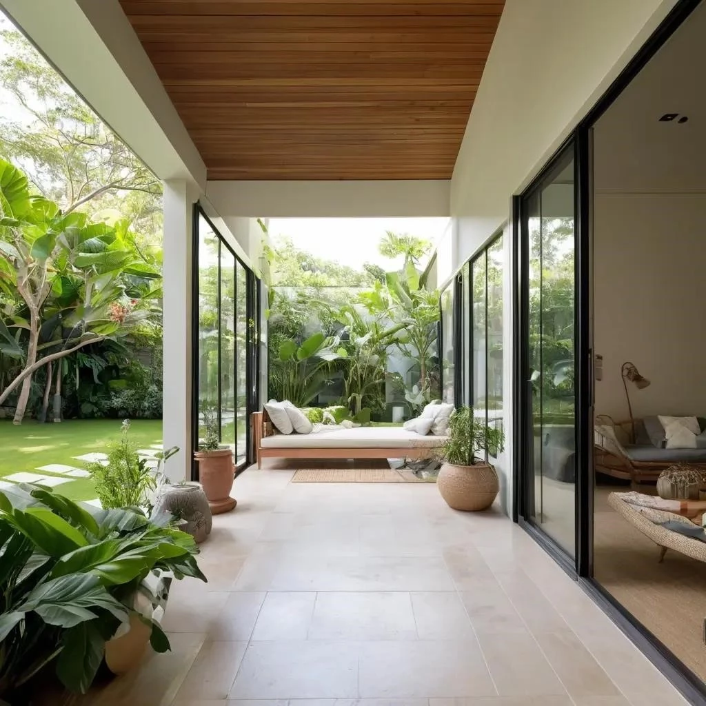Современный дизайн склонен к минимализму. Он также ценит функциональность. Применяют стекло, поликарбонат, металл. Раздвижные системы, безрамное остекление подчеркивают открытость. Для открытой веранды это идеально. Патио становится стильной летней комнатой. Освещение акцентирует чистоту линий. Это формирует современный дизайн.