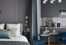 В выборе отделки старались соблюсти баланс между современным стилем и классикой. Так, стены покрашены светлой краской, в спальне для легкого ненавязчивого акцента добавили обои. В обеих комнатах разнообразили отделку настенными молдингами.