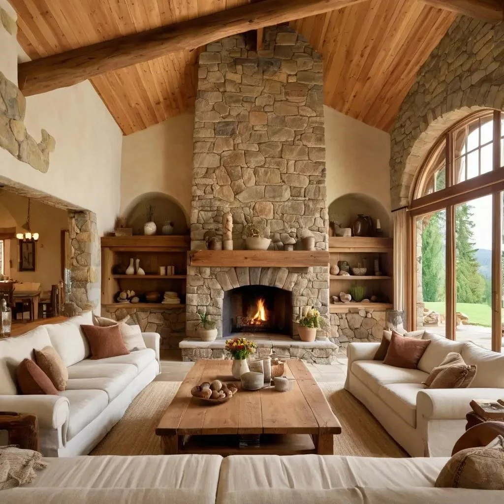 Создание уютного интерьера вокруг камина в гостиной превращает его в истинный семейный очаг, наполняя атмосферой тепла. Дровяной камин становится центром каминной зоны. Мягкая мебель, вроде дивана у камина или кресла-качалки, формирует комфортное пространство для загородной жизни. Журнальный столик и полки с продуманным декором гостиной дополняют картину. Правильное освещение и текстиль (пледы, подушки) усиливают ощущение уюта. Дровница, каминные принадлежности эстетично завершают образ.