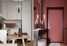 Напольное покрытие, отделка стен… Но что если разграничить пространство при помощи потолка? Так поступила дизайнер в этом смелом проекте для любителя китайской культуры. Линейная кухня сочетает в себе черный, белый, красный цвета. В тон ярким фасадам сделали и выступающий потолок, который визуально четко обозначает: здесь кухня. Этот прием вышел за рамки задачи просто разделить пространство и позволил создать уникальный дизайн.