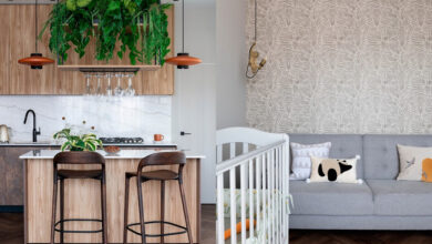 В отделке стен общих зон применили светлую краску. Так как основной стилистикой выбрали современную классику, использовали лепной декор: молдинги, высокие карнизы. В спальнях и кабинете применили обои. «Они привносят уют и мягкость в помещения. Интерьер спальни хозяина отличается строгим мужским стилем. Здесь сочетаются четкие линии, геометрические орнаменты и текстуры в текстиле, а также обои с цветами камелии и глицинии золотисто-черного цвета, рисунок датирован 1838 годом. Эти элементы подчеркивают зрелый вкус владельца, а также создают уют и элегантность, объясняет Дарья.