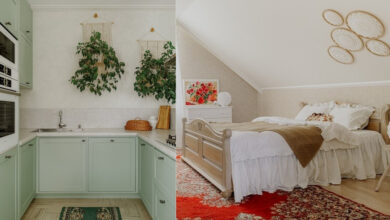 Особое внимание дизайнер обращает на решение со шкафом в мастер-ванной. Эту угловую систему хранения закрыли дверцами, изготовленными из ротанга и покрашенными в цвет стен.